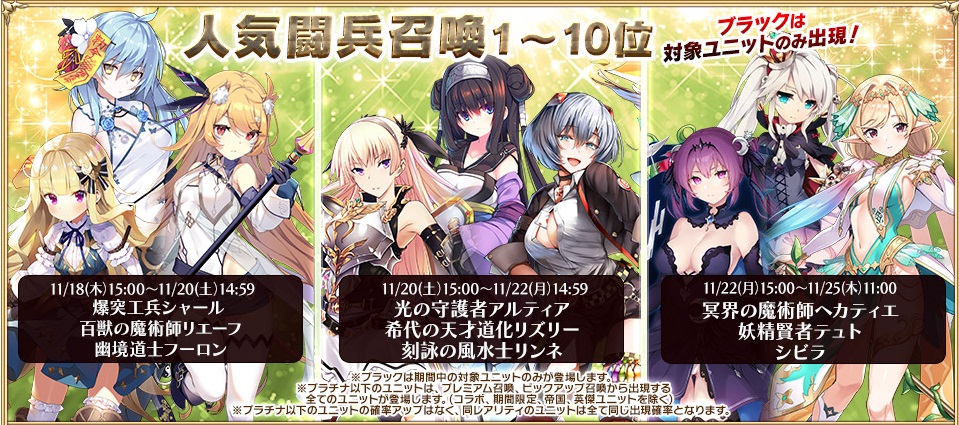 アイギス 召喚士- 千年戦争アイギスにご登録いただいた全ユーザーの皆さまに 「ブラック確定チケット」を1枚お送りいたします。 ※『ブラック召喚チケット』から登場するのは、 23年1月19日まで アイギス 緊急ミッション「AIGIS Idol Project」攻略動画 23年1月19日~2月2日開催の、プラチナのアイドル召喚士「召喚系アイドル リノ」」を入手できる、試練型緊
